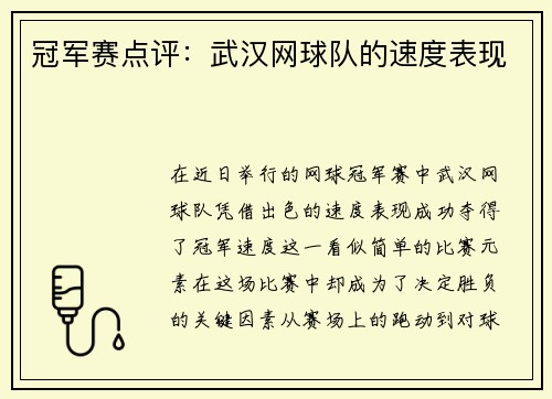 在近日举行的网球冠军赛中,武汉网球队凭借出色的速度表现成功夺得了冠军。速度,这一看似简单的比赛元素,在这场比赛中却成为了决定胜负的关键因素。从赛场上的跑动到对球速的控制,武汉网球队通过其快速的反应和高效的移动,展现出了不同寻常的竞技水准。
